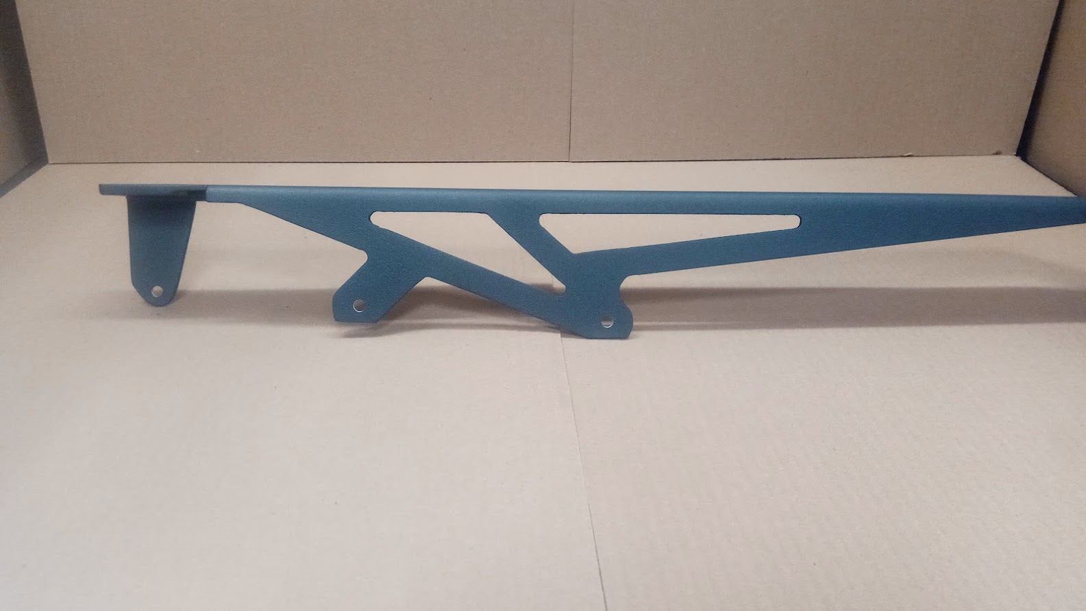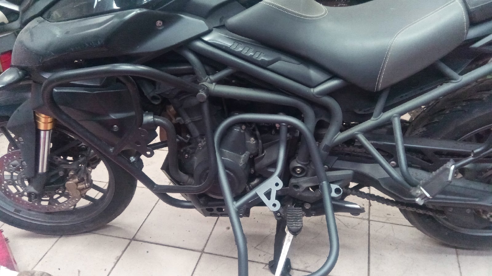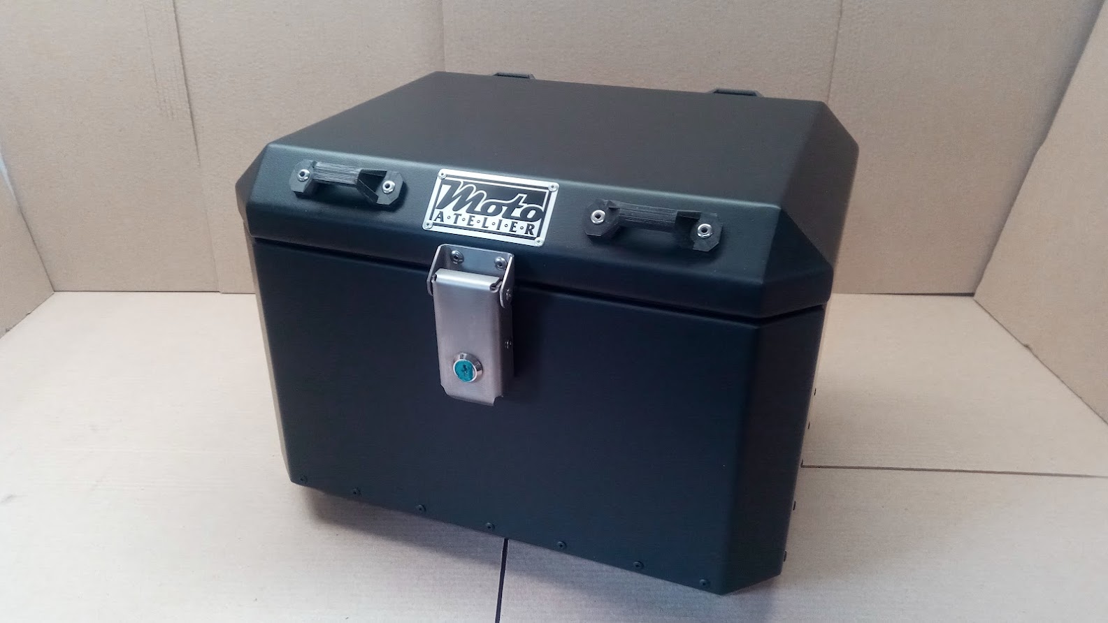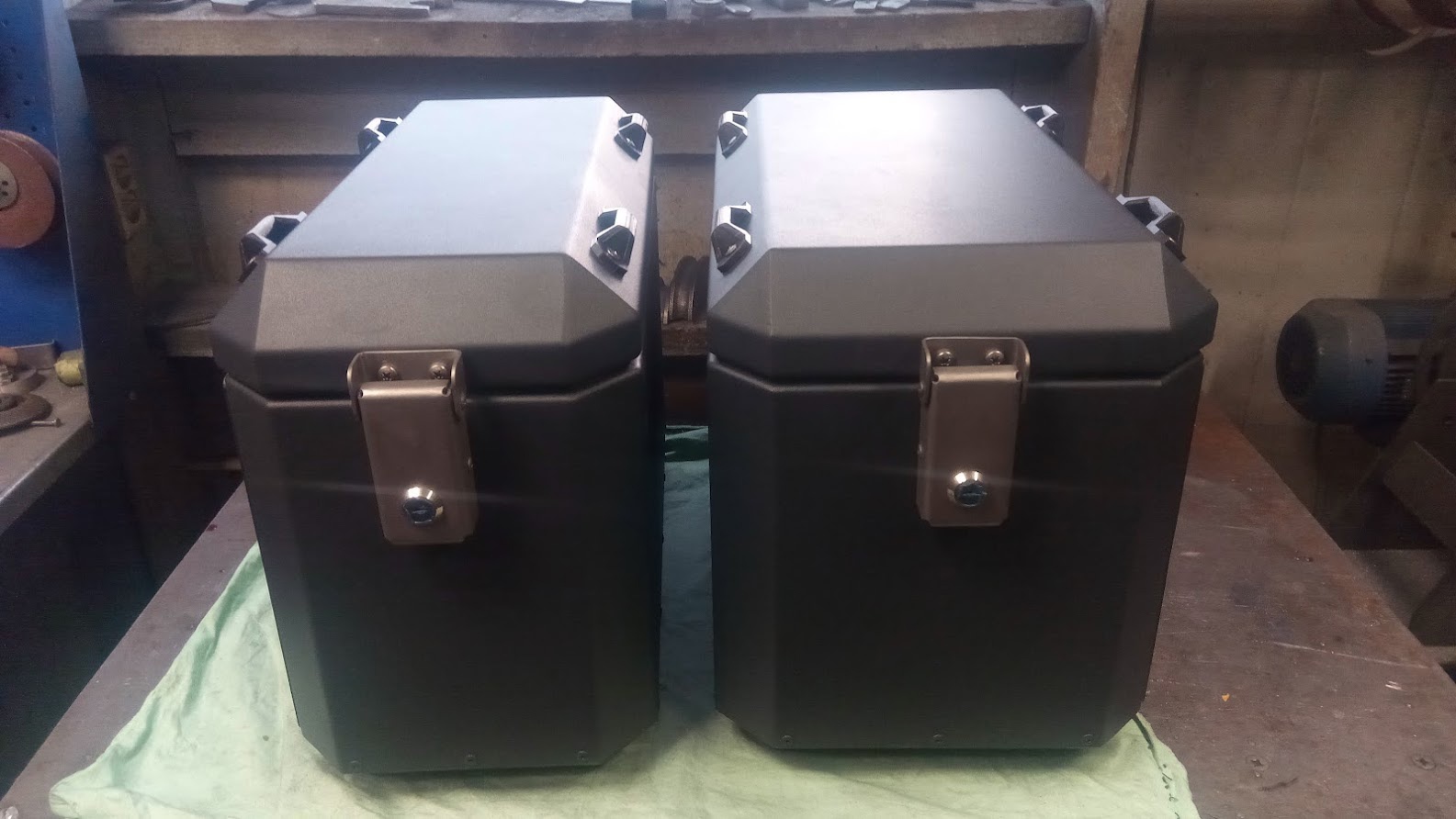 Центральный кофр . Размер 440-340. Высота 320. Примерный объем 46 литров. Сделан из листового алюминия 2мм. Дно усилено 4мм. Вес 5,2 кг. Вмещается один мотошлем. Замок , который позволяет открыть его даже рукой в перчатке. С возможность закрыть кофр, не запирая личинки замка. На крышке установлены скобы для крепления дополнительного груза. Изнутри на крышке скобы для крепления багажа. Шарниры из нержавеющей стали.