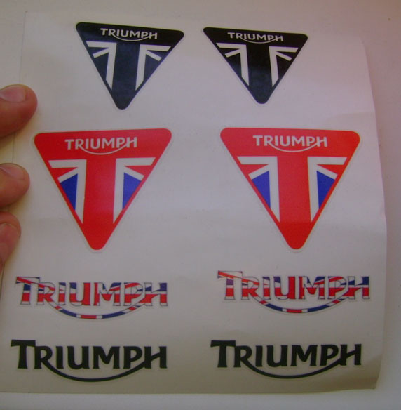Продам наклейки Триумф, напечатаны на прозрачной! плёнке. Белый цвет не напечатан!, чтобы был белый цвет, надо клеить на белый фон. На какой фон наклеите, таким цветом будет отображаться цвет, который сейчас на наклейках выглядит белый (из-за того что подложка белая). Размеры - чёрные треугольники 5*5 см, красные 6*6см, надписи - 1,5 см на 6 см.