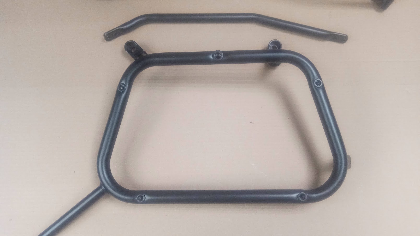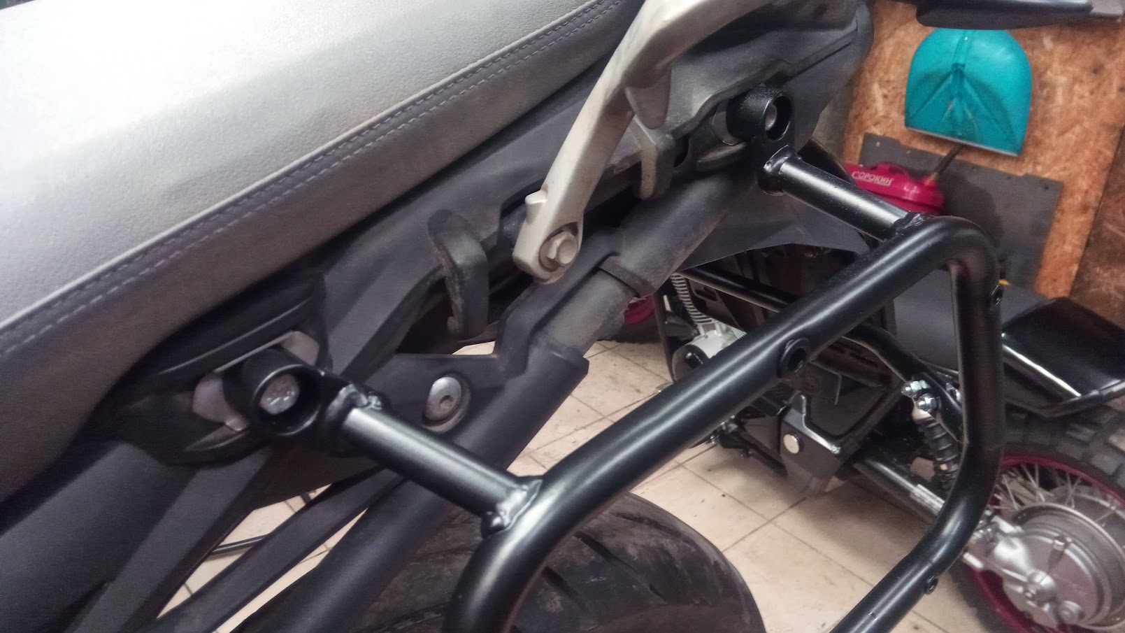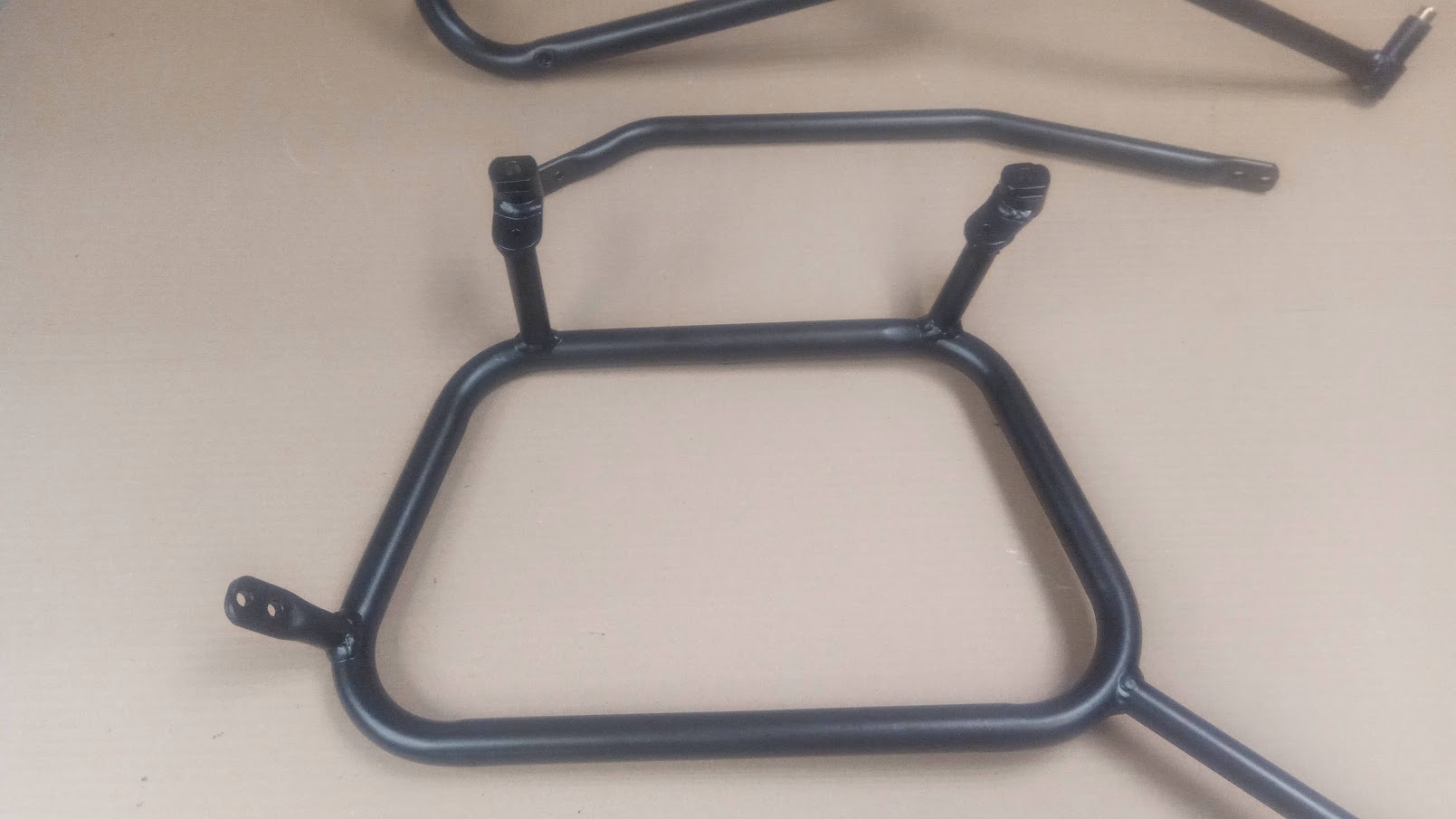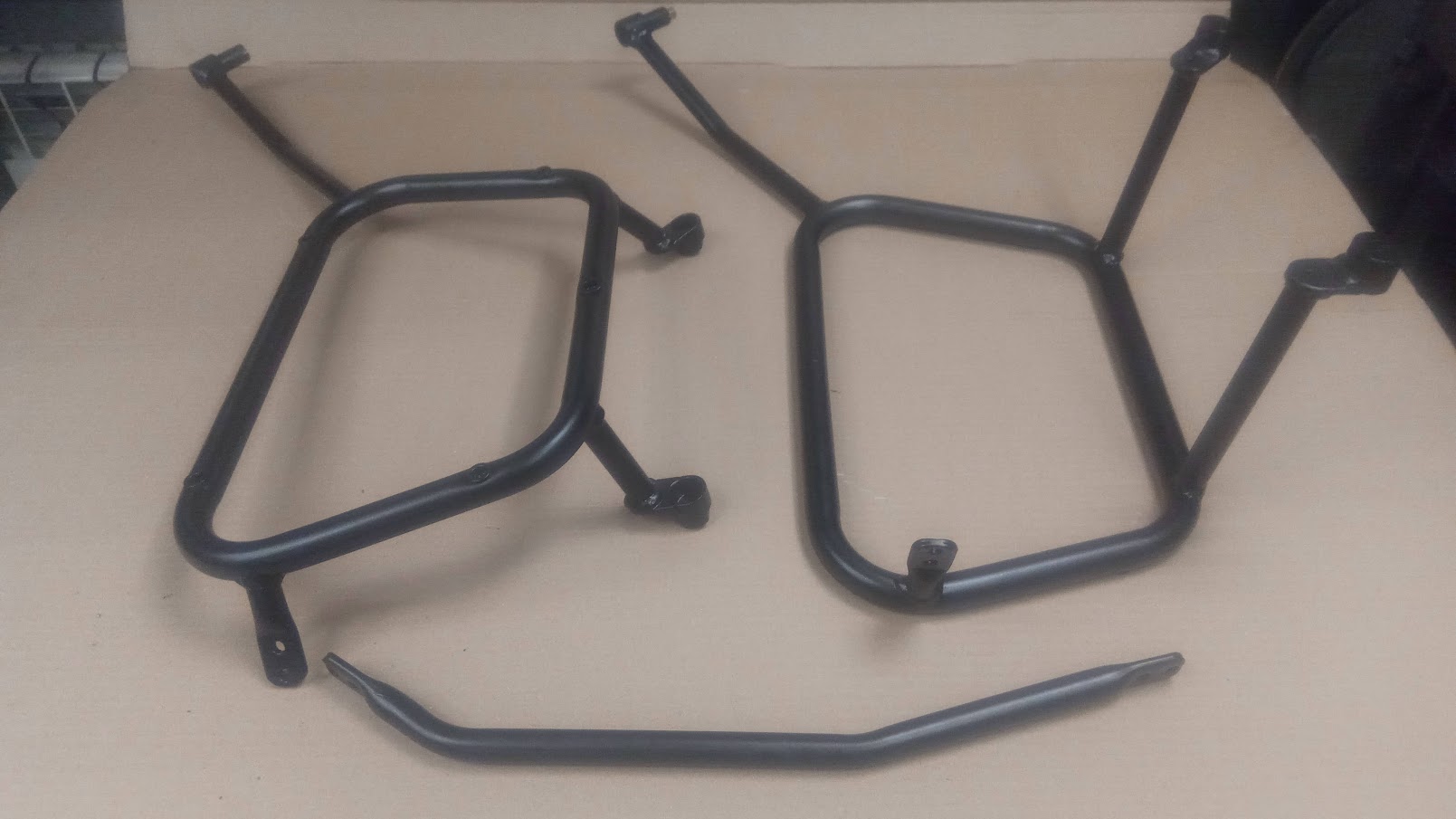 Боковые рамки под алюминиевые кофры. Сделаны из бесшовной трубы ст.20. Сама рамка диаметр 20мм. Детали крепления 16мм.Без элементов крепления кофров. Форма рамки подчеркивает основные линии мотоцикла. Что на мой вкус смотрится выгодней классической прямоугольной формы.