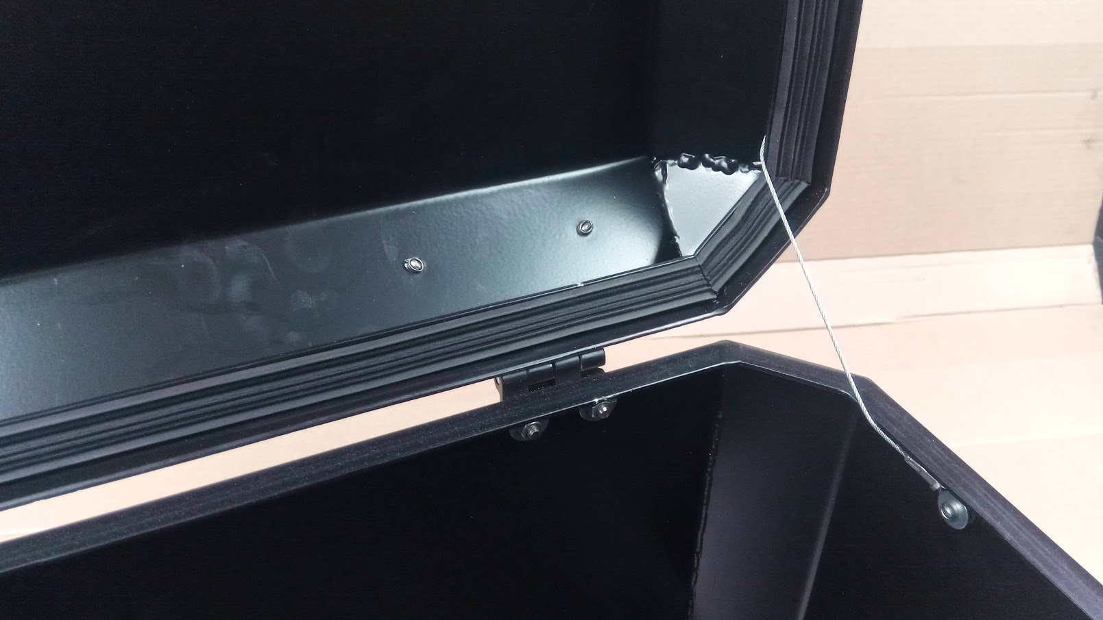 Кофр имеет свои конструктивные решения. Такие как лабиринтовое уплотнение крышки. Замок , который позволяет открыть его даже рукой в перчатке. С возможность закрыть кофр, не запирая личинки замка. На крышке установлены скобы для крепления дополнительного груза. Покраска порошком.