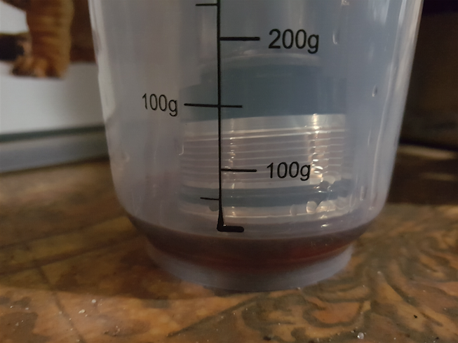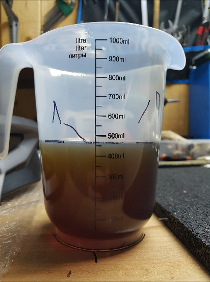 Слил, получилось, в лучшем случае - 460мл. Сливал в несколько этапов: 1-Слил до последней капли, 2-Закрутил крышку качнул немного и снова слил, 3-Поставил в стакан и еще немного покачал вверх/вниз, налилось немного. Оставил на ночь, жду. Но думаю вряд ли еще 100мл стечет.