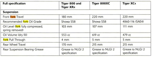 Далее там с помощью специального шприца советуют закачать в перо вилки масло и измерить уровень масла. Для тигер 800 уровень должен быть 103 mm, объём 553 cc , марка масла Showa SS 8.