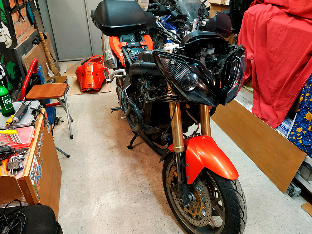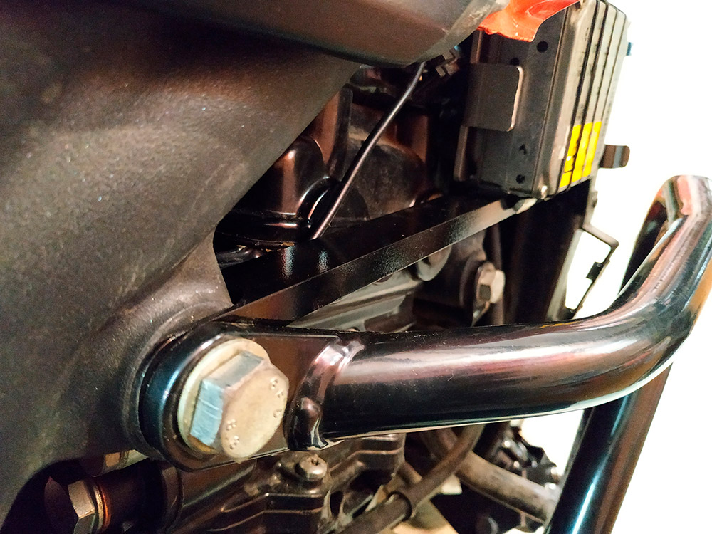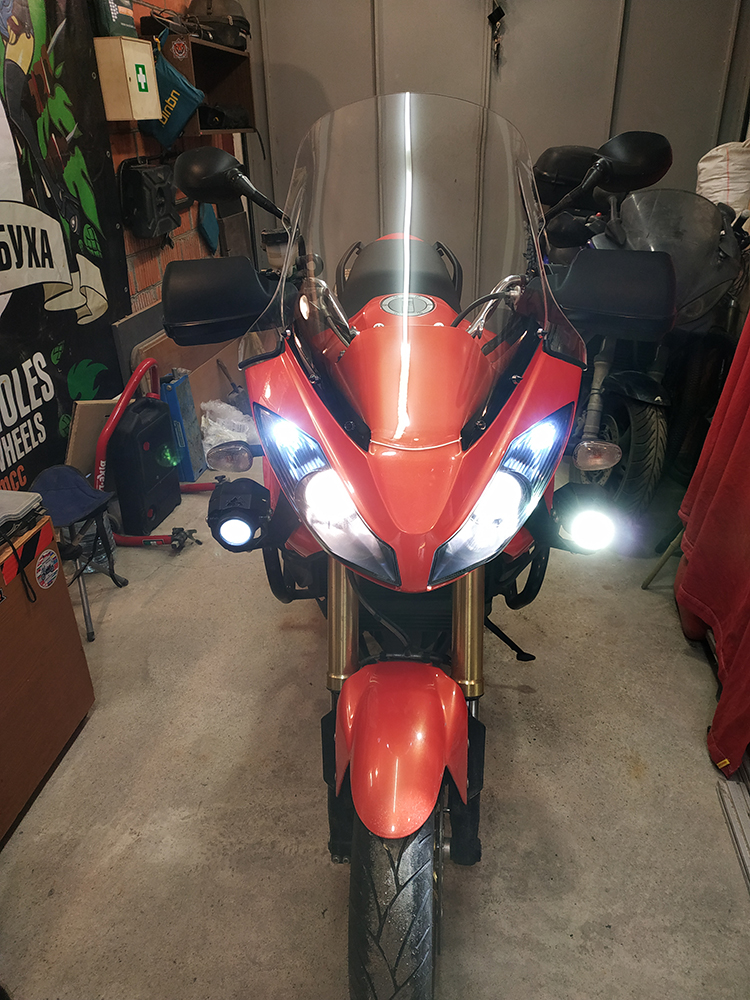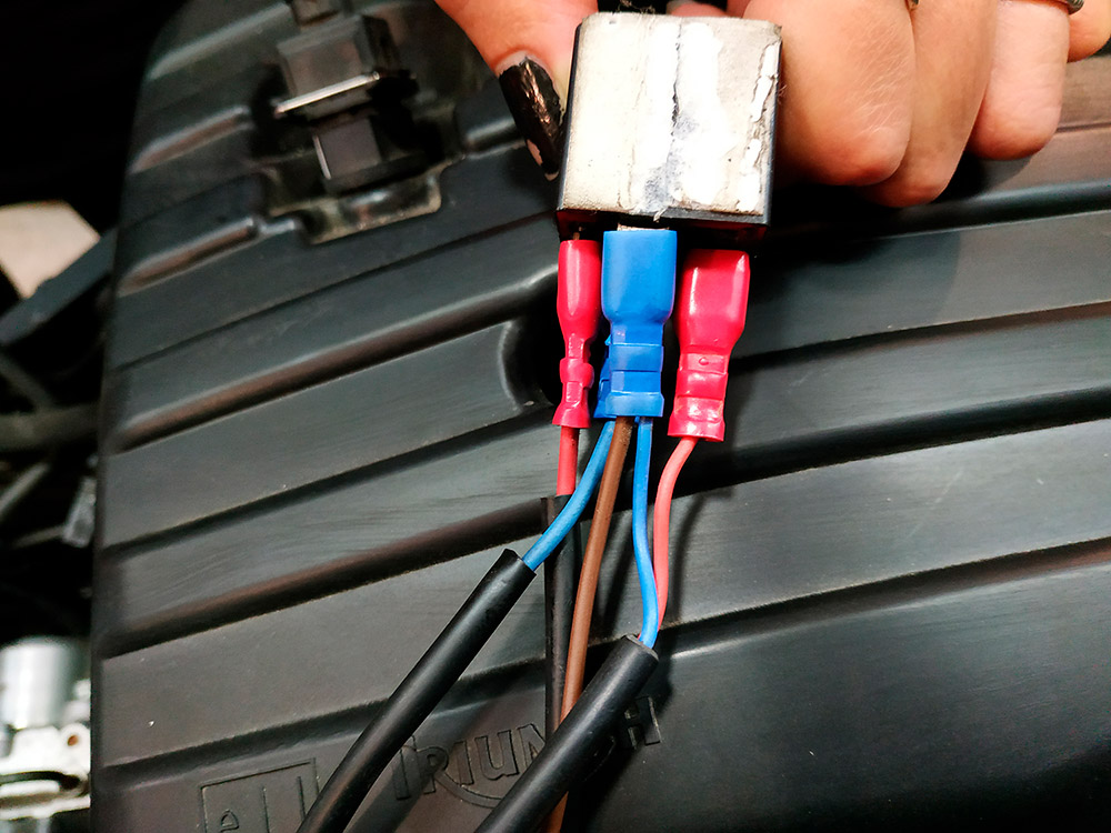 И задача у меня была скрестить две части ксеноновых ламп. Блок розжига у меня стоит на хитром креплении с левой стороны под пластиком. Надо было что-то придумать на правую сторону и затем всё подключить так, что бы лампы включались только на включённом мотоцикле и не зависели от ближний/дальний.