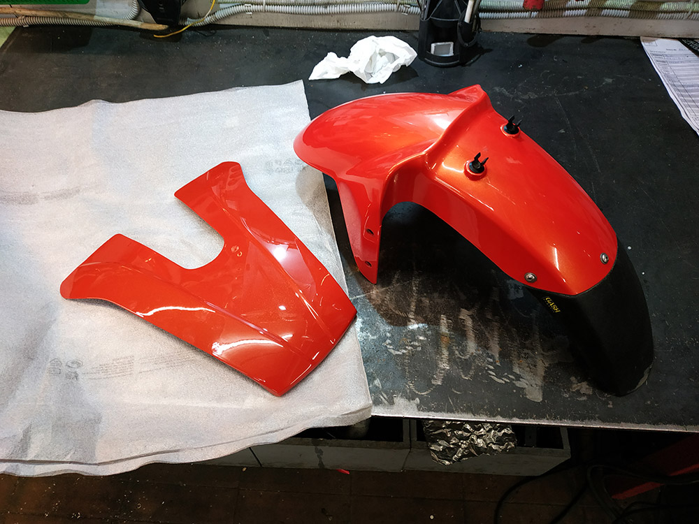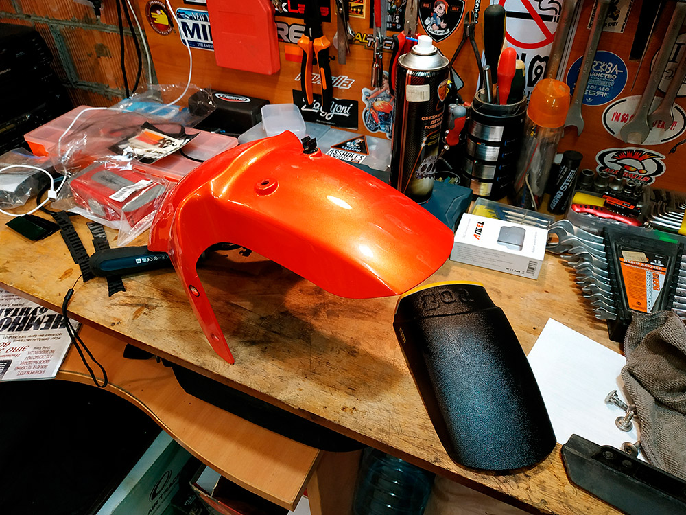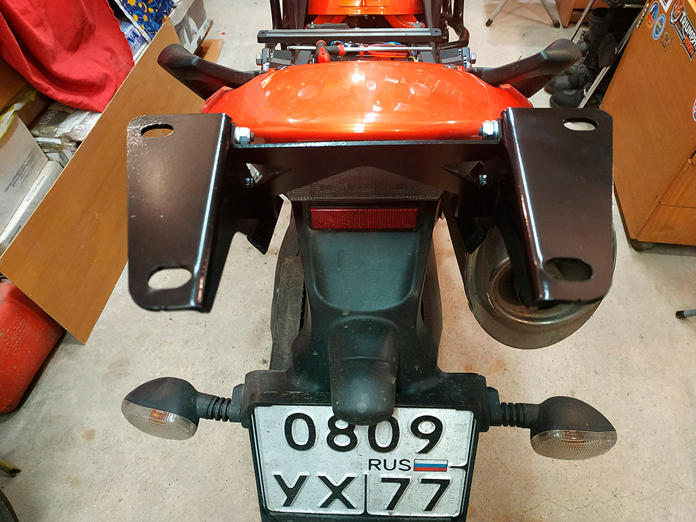 Накладка сама серебристого цвета, но я хотел её покрасить в оранжеввый металлик, в цвет мотоцикла. Не сразу я нашёл где это сделать не очень дорого, но в итоге мотоцикл с кофром получил законченный композиционный вид :)