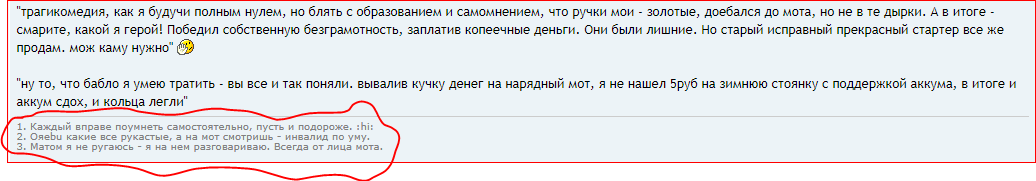 "трагикомедия, как я будучи полным нулем, но блять с образованием и самомнением, что ручки мои - золотые, доебался до мота, но не в те дырки. А в итоге - смарите, какой я герой! Победил собственную безграмотность, заплатив копеечные деньги. Они были лишние. Но старый исправный прекрасный стартер все же продам. мож каму нужно" :hi: