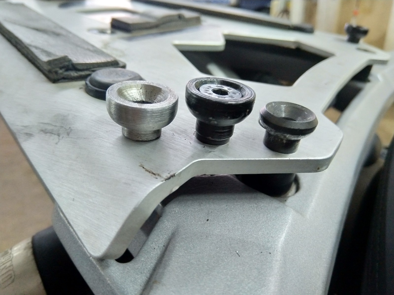 А у меня Треккер. Сам по себе кофр тяжёлый, и ухи крепёжные у него больше. Идею подкинули ребята из SW Motech. У них есть два типа крепежа под Гиви на их рамки, обычный и для Треккера. У последнего клипсы заметно больше. А мой топкейс стучит и болтается. Решил переделать. Знакомый токарь запилил это всего за 100 рублей, использовав форму "грибков" от SW (в Гиви наверное об этом не знают )))