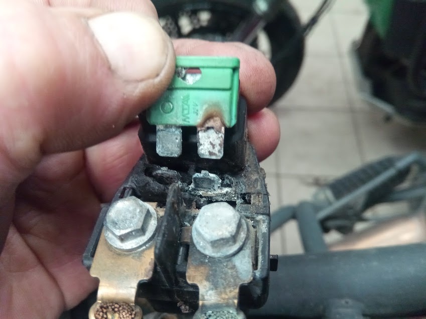 san, оставив предохранитель на месте реле, вы не решите главную проблему - попадание влаги и окисление контакта в месте крепления предохранителя. В качестве аргумента фото состояния предохранителя после очередной замены. Менял его на перевале Медвежий Крест в Грузии. После замены пробег примерно 8000 км. И хоть все было зачищено и мамы были обжаты плоскогубцами , процесс нагрева от окисления пошел.