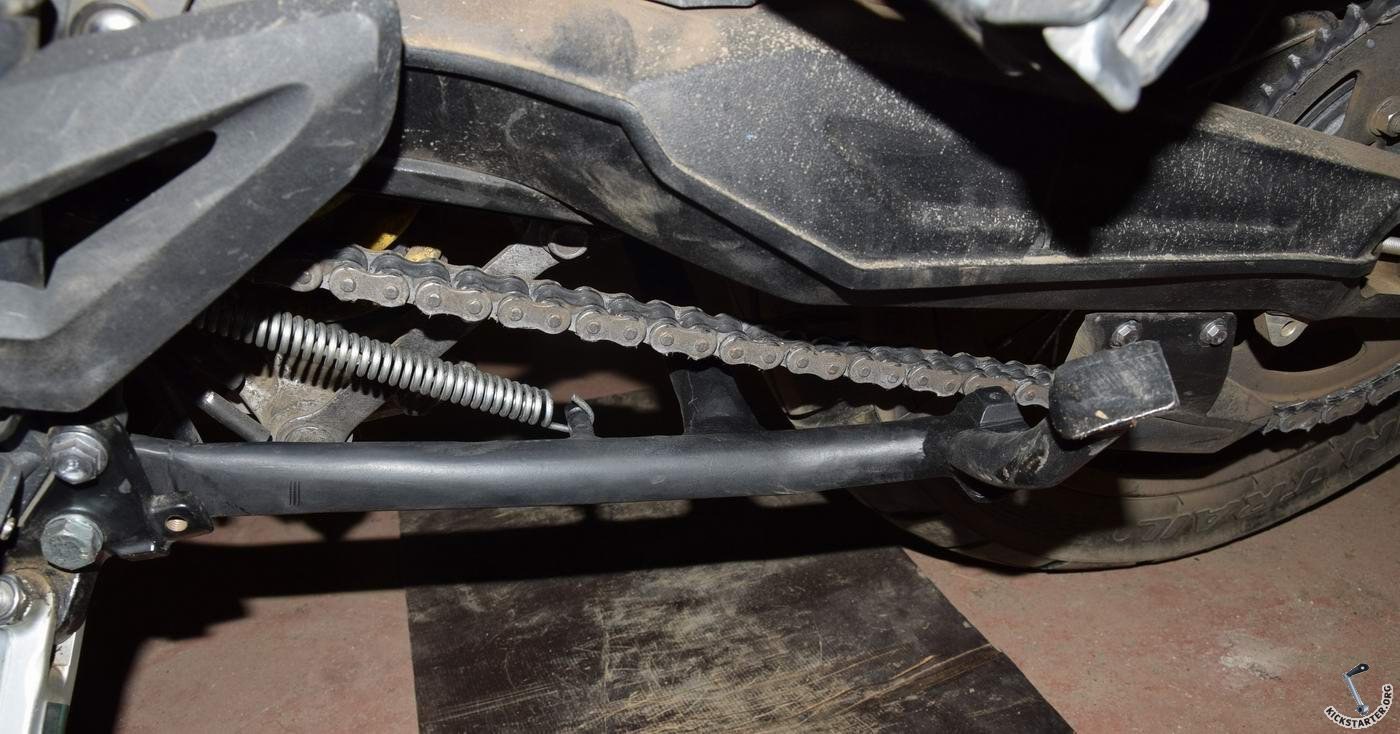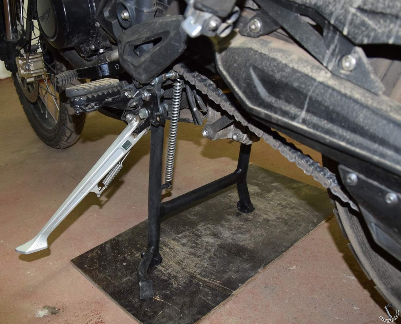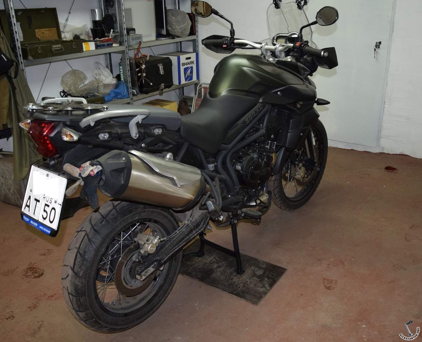 Расскажу про самопальную центральную подножку. В общем осенью после покупки мота загорелся я идеей прикрутить централку, ибо удобно и цепь смазать и колёсико снять и т.д. От цены за оригинальную охренел - более 20 т.р. с доставкой. За что? Я на трансальп покупал не так давно за 3500р с доставкой подножку шикарного качества, делают ребята с Украины, контора "мото карт". А тут те же 3 трубки но в более чем 5 раз дороже. Короче нашёл я через интернет Александра, он на Водкомоторнике заводил как раз тему о самостоятельном изготовлении централки на тигра 800го XC, замутил он себе сам такую и попросил я его изготовить такую и мне. Он не оставил товарища в беде и изготовил мне подногу {$default_smiley_smiley} Обошлась она мне в 5000р + пересыл. Накатал с ней 1500 км пока, претензий нет, работает отлично. Работает как положено, заднее колесо вывешивается сантиметров на 6, переднее в этот момент на земле. Спрыгивает мот с централки с ощутимым усилием, т.е. самопроизвольно никуда с неё не слетит. Пружина крепится не как оригинальная, без спец приспособ просто на болт. На фото видно. Страница парня, который мне подногу делал: http://vk.com/markan.tiger